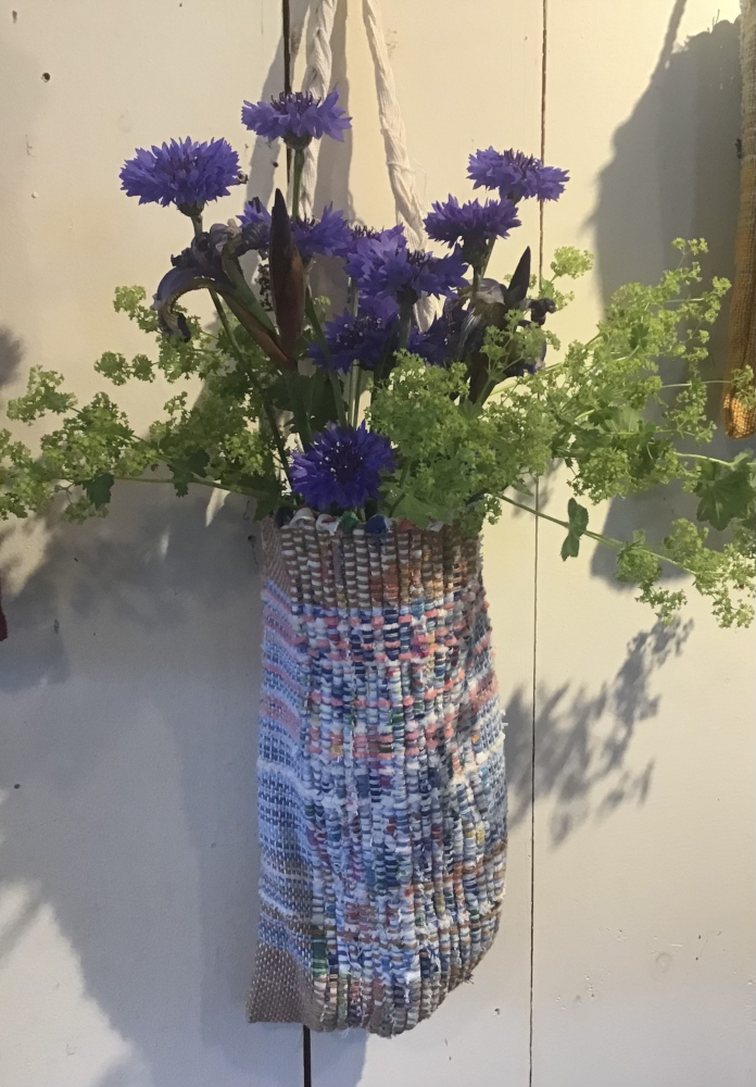 Made from sturdy cotton and recycled blue jeans. Ready for your bouquets or come by and pick up one already made. Can hang from a nail, hook or door knob.